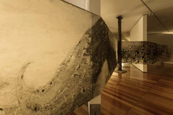 Tomando como ponto de partida uma imagem retida na sua memória (a raríssima lula gigante mantida em formol numa das salas do Aquário Vasco da Gama em Lisboa, mas também a lula gigante efabulada a partir das descrições de Jules Vernes no seu 20,000 Léguas Submarinas, ou ainda a lula gigante reproduzida nas imagens transmitidas pelos robots que hoje perscrutam o fundo dos oceanos), e fazendo justamente uso do fragmento enquanto ferramenta operativa de representação, Hugo Canoilas constrói uma pintura de dimensões imensas que se propõe ao espectador como um enorme desafio perceptivo.