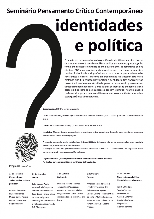Inscrições: 20 euros (inclui o acesso a todas as sessões e a todo o material em discussão no seminário, bem como um exemplar do n.º 1 da revista Imprópria).A inscrição em sessão avulsa está limitada à disponibilidade de lugares, não sendo susceptível de reserva prévia. Nesse caso, o valor da inscrição é de 6 euros.A inscrição deve ser feita por transferência bancária, através do NIB 0035 0127 00055573730 49, seguida de e-mail com o comprovativo para cursopcc@gmail.comLugares limitados (a inscrição deve ser feita o mais antecipadamente possível).No final do curso será emitido um certificado de frequência. O debate em torno das chamadas questões de identidade tem sido objecto de uma enorme controvérsia mediática, politica e académica, que tem ganho forma em discussões em torno do multiculturalismo, do feminismo ou dos direitos LGBT, mas também, mais recentemente, em torno de questões relativas à identidade socioprofissional, com o tema da precariedade a dar nova ênfase a debates em torno da problemática do trabalho. Este curso pretende discutir a relação entre política e identidade a três níveis diversos mas entre si relacionados – etnicidade, género e classe –, sendo que ao mesmo tempo pretendemos debater a própria ideia de identidade enquanto base da acção política. Trata-se de um debate a ter sem identificar nenhum público preferencial e para o qual convidámos académicos e activistas que sobre estas questões se têm debruçado. Programa (provisório): 17 de SetembroMesa-redonda «Identidade e sujeitos políticos»António GuerreiroBruno Peixe DiasMiguel Serras PereiraFátima Orta JacintoHugo Monteiro