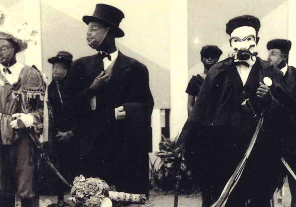 Military power is symbolised in the uniforms and white gloves; administrative power in the suits, the telephones, typewriters, glasses and briefcases; the power of knowledge in the student ribbons; all these accessories from our own days show that the problems illustrated in the Tchiloli are an expression of the world of today.