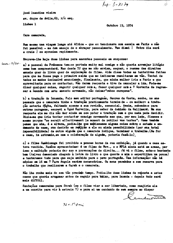 «c) o filme Sambizanga foi proibido a poucas horas da sua exibição, já quando a casa estava vendida. Razões apresentadas: é um filme do Mov[imento], e o MPLA ainda está em armas, por isso a exibição poderia dar azo a provocações de direita… Já vi o filme, acho-o bastante bom (talvez demasiado chegado à letra do livro o que quanto a mim o espartilhou um pouco) e tentaremos tudo para que seja exibido para o povo português. Uma informação: não há cópias em 16 mm? Para Angola seriam necessárias. Os meus parabéns e sem reserva para o trabalho que realizaram a Sarah e o camarada. […] (se o filme vier a ser libertado, como reagiria ela a um convite para vir à estreia?)»