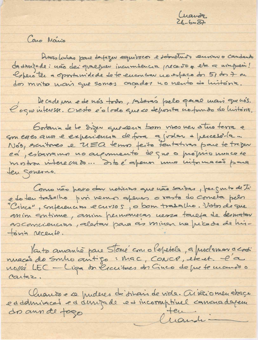 Recebi a carta pelo João Sá da Costa e passo a responder resumidamente talvez esperando ter o prazer de te abraçar cá no 10 do próximo… Não é possível remover as dificuldades que existam?