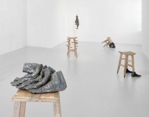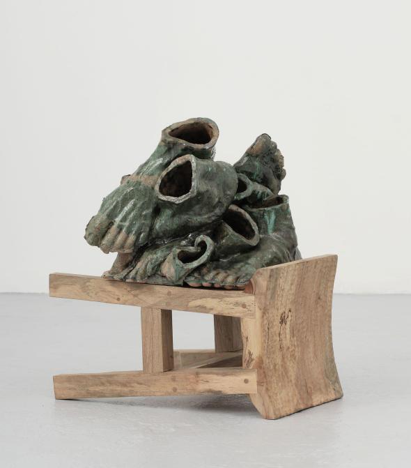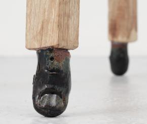 A instalação Menino, não fala política organiza-se em torno de quatro elementos: esculturas de pés e dedos em cerâmica vidrada, bancos de madeira, chapas de ferro e arames, e papel.