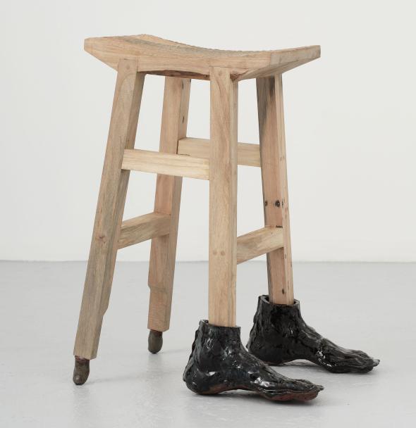 A madeira dos bancos provém de uma única mafurreira, árvore presente nos quintais e nas paisagens moçambicanas. Os bancos funcionam como palanque, palco e símbolo de superioridade. É de cima que se fala às massas ou se ignora quem está por baixo. Entre os suportes, pés descalços sustentam o peso do poder, enquanto outros tentam derrubá-lo. Essa é também a sina de quem se eleva.
