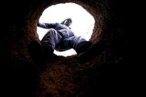 A área das minas é composta por montinhos de terra entre árvores e buracos profundos. Marinfim ata uma corda ao troco de arvore, na outra ponta está meia cabaça. Desce terra adentro, com movimentos sincopados entre as costas num dos lados do buraco e as pernas do outro. Lá em baixo desfaz com a picareta um pouco mais do quartzo que envia pela cabaça presa à corda.