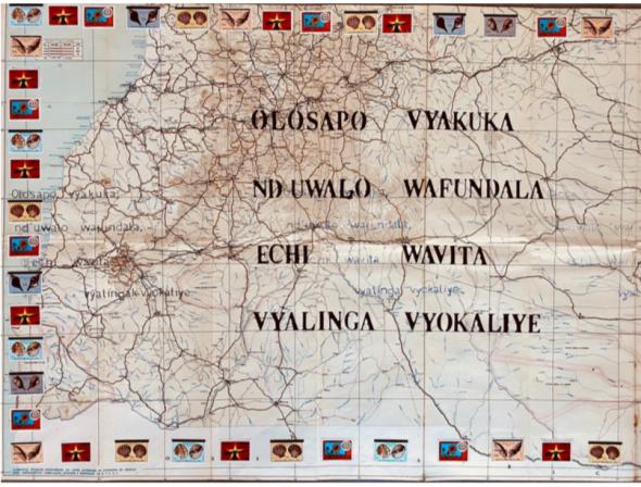 Olosapo, vyakuka, nd ́uwala wafundala, echi wavita vyalinga vyokaliye. (Umbundu) Histórias velhas, como roupas enxovalhada ao contá-las tornam-se novas. | 2020 | Yara Monteiro (cortesia da artista e escritora) (mapa rodoviário de Angola 1967 e selos angolanos, papel químico, caneta, marcador)