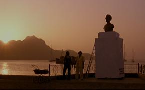 FIGURA 1 _ O busto de Cabral em seu pilastre.O busto de Amílcar Cabral não só ganha o lugar outrora dedicado ao viajante, como seu posicionamento é diverso e significativo. A estátua de D. Afonso está voltada para o mar, enquanto a de A. Cabral, para a terra, ou seja, se aquele saúda o mar e o além-mar (Portugal), este saúda sua terra e sua gente – e, pelo filme, é ali que deve estar.