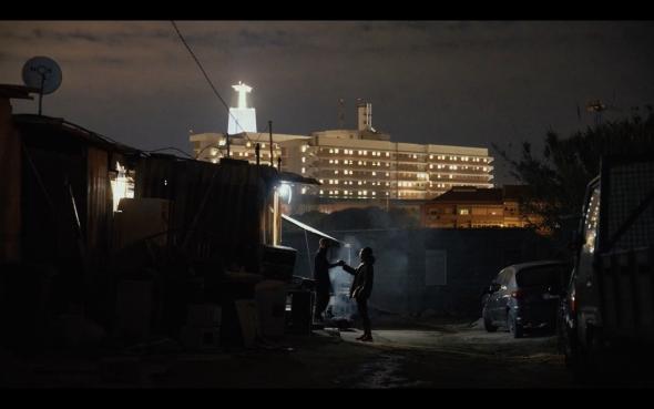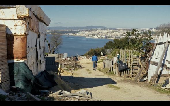 Quando a câmara finalmente recua e o ângulo se expande para revelar o Tejo no horizonte, Lisboa ao fundo, e a luz amarelada a bater sobre a cidade branca, a alegoria torna-se evidente: há bairros que vivem com Lisboa à vista, mas nunca exactamente alcançável.