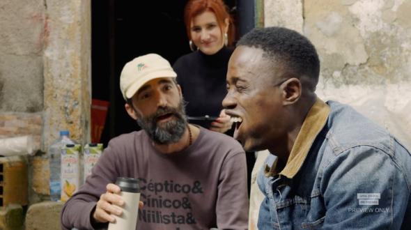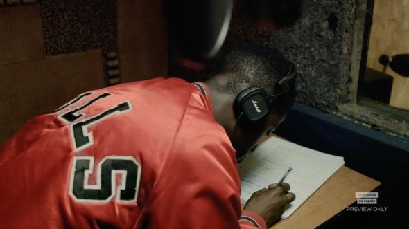 Vejamos, por exemplo, a sequência de sete minutos que começa ao quarto de hora. Ghoya num estúdio simples — isolamento em contraplacado, tapete marroquino na parede —, toca um beat grave em loop. Anda de um lado para o outro, balança, atira rimas. As palavras saem-lhe da boca e caem no papel, intensas, em kriolu acelerado, entrecortadas por gíria de Lisboa e trocas rápidas em codeswitch, o “djam fadja” que funde-se com um “ya, um coche”. Na cabine de som, envergando um casaco dos Chicago Bulls encarnadíssimo, Ghoya rebenta: