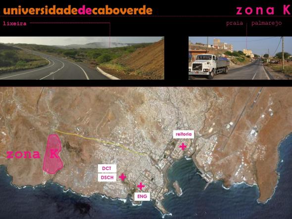 Por sua vez, o governo central tem planos de implantar um grande bairro institucional na zona periférica da cidade, a oeste de Palmarejo, em direção à Cidade Velha, denominada Zona K, na qual estaria uma parte de 30 hectares designada para a universidade. Esta parece ter sido a área melhor recebida pelos setores decisórios da Uni-CV, conforme relatórios internos, por apresentar vantagens econômico-financeira (terreno doado); técnico-científicas (proximidade do mar permite desenvolver projetos de investigação sobre energia), economias infraestruturais (proximidade da infraestrutura urbana de água e luz).
