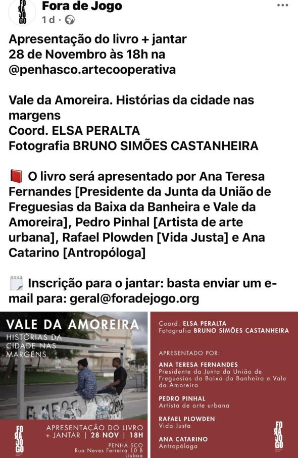 O livro Vale da Amoreira: Histórias da Cidade nas Margens, de Bruno Simões Castanheira (fotos)Elsa Peralta (coord.) reconstrói a formação do Vale da Amoreira como expressão das grandes transformações sociais, políticas e económicas do Portugal contemporâneo – e da Margem Sul de Lisboa em particular. Localizado no concelho da Moita, o bairro nasceu do cruzamento entre industrialização e império, êxodo rural e urbanização acelerada, migrações internas e fluxos populacionais associados à descolonização. Trabalhadores vindos do interior rural, retornados, refugiados e imigrantes africanos convergiram neste território nos anos 1970, num processo marcado pela precariedade das políticas públicas de habitação e pelo improviso das ocupações de casas.