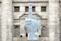 Cattelan questiona, a partir da inserção do corpo na política de elisão corporal do capitalismo financeiro, justamente a possibilidade de democracia frente ao sistema que vive bem ali na Piazza Affari em Milão: A sociedade de controle por si. Um questionamento da possibilidade de concretização da concepção agambeniana de que o nomos de nossa sociedade contemporânea é o campo de concentração.