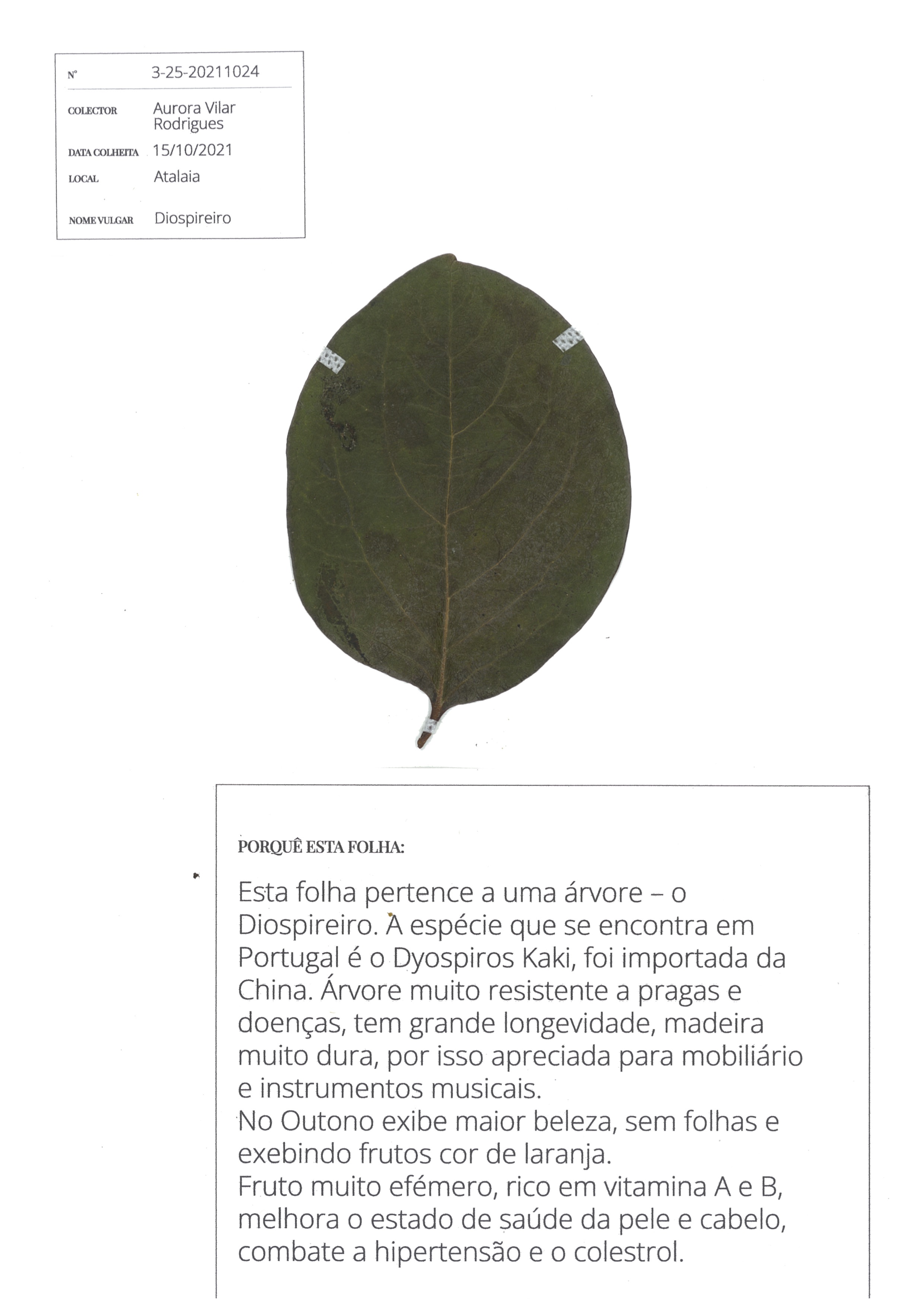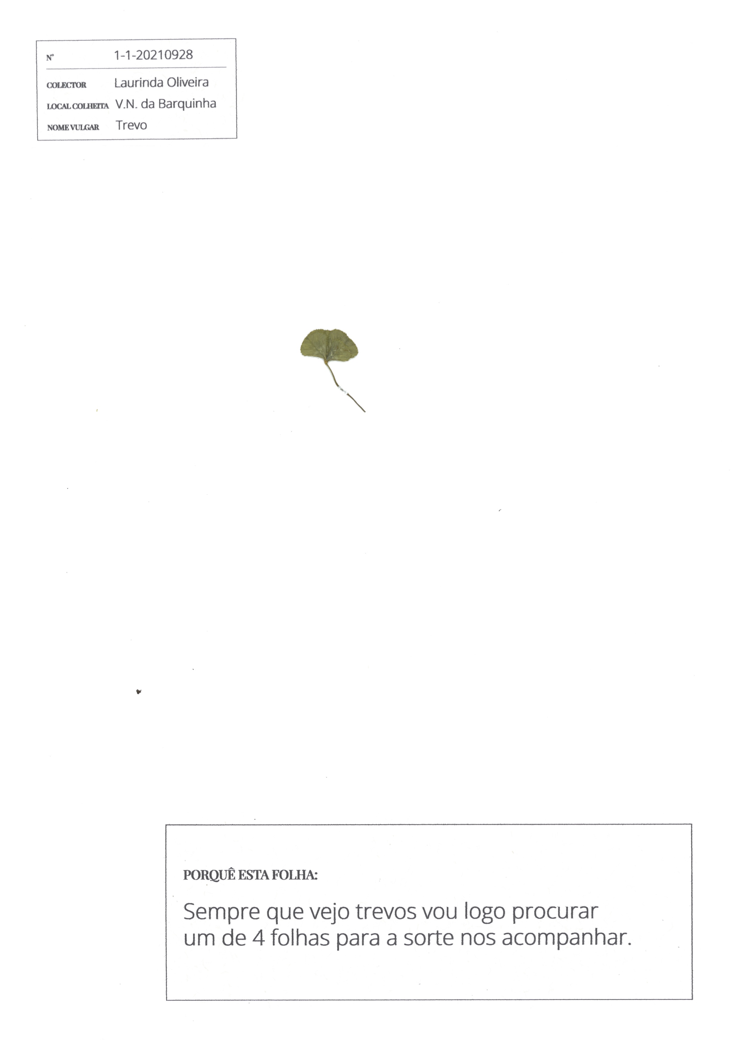 Em setembro e outubro de 2021, em residência artística em Vila Nova da Barquinha no Centro de Estudos de Arte Contemporânea (Ceac), constituí um herbário a partir de folhas de plantas ou árvores. Solicitei essas folhas na Associação Barquinha Saudosa (grupo de cantares), no Ceac e num dos quatro polos da Universidade Sénior do concelho, gerida pela Associação Essência da Partilha e dinamizada por voluntários. A cada pessoa destas três instituições, ali presente no momento, foi apresentado o projecto e entregue uma ficha para completar, onde se podia ler: