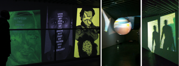 Totalmente às escuras, dentro do EACC vimo-nos imersos num ambiente onde a voz ocupava espaço, com gigantescas projeções de imagens sobre as paredes e também sobre um globo aceso como em «So much Trouble» (2016), em que as imagens discorrem como se fossem a retina do mundo.