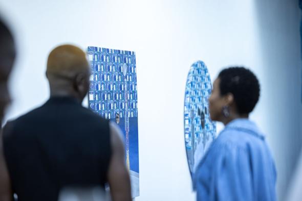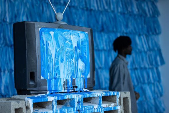 As pinturas do Gegé Mbakudi são uma continuação da importância do sonho e a fantasia, no seu processo criativo. O artista explora as várias possibilidades que a arte nos oferece para sequestrar a narrativa oficial e inverter as relações de poder. Gegé desloca elementos da paisagem urbana que fazem parte da nossa memória coletiva para a imensidão do azul de uma cidade suspensa nas nuvens. O azul é o pano de fundo da cidade. As estruturas de poder, os símbolos nacionais, os monumentos históricos, deixam de pertencer à dimensão terrestre para serem elevados a um patamar celestial, lembrando-nos do poder dessas estruturas em ditar o futuro de cada cidadão, tal como representar o seu passado. Na obra intitulada “Acabar com a espera” (2023), vemos na tela uma cadeira a arder, parte da mobília de plástico popularmente conhecida como “espera condições”. Esta imagem representa, de modo sublime, uma geração que se recusa a viver de vagas esperanças.